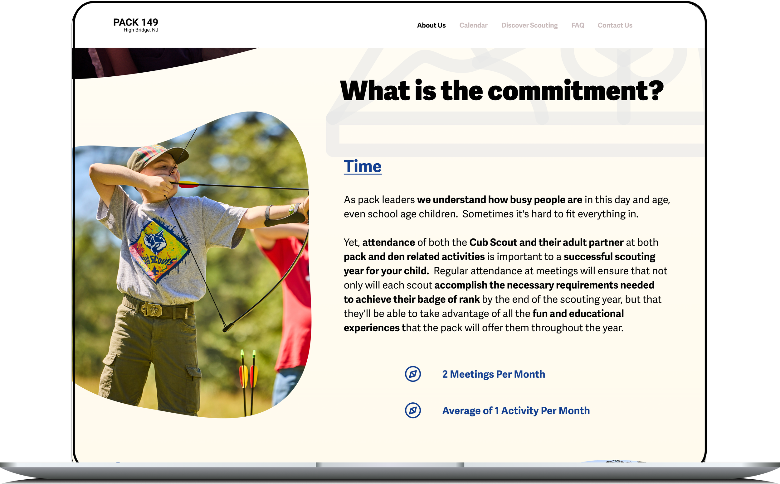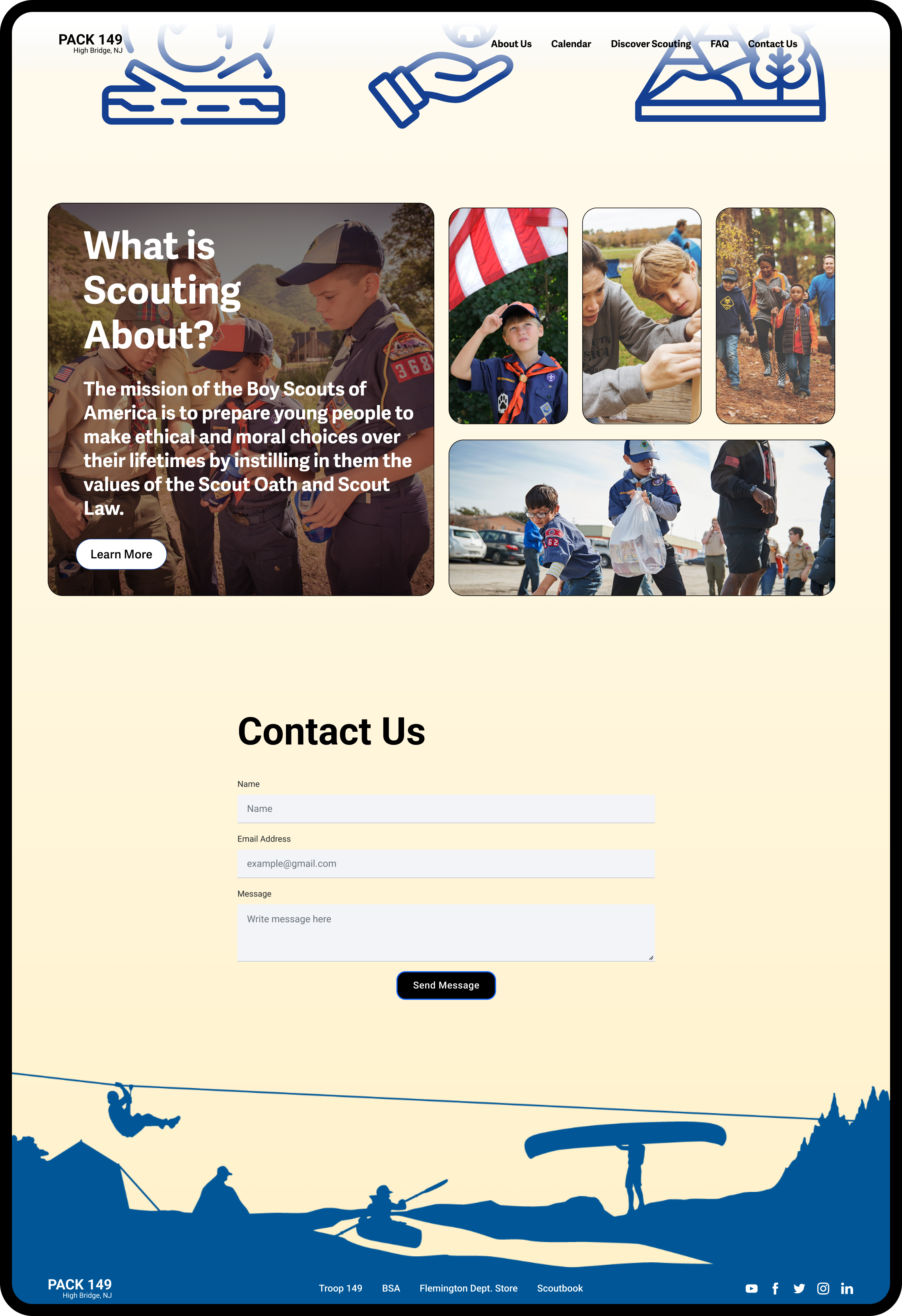 The Home Page is designed to showcase what the Cub Scouts is all about with an introduction to Pack 149. This page is the face of the organization and the first thing that potential recruit will see.