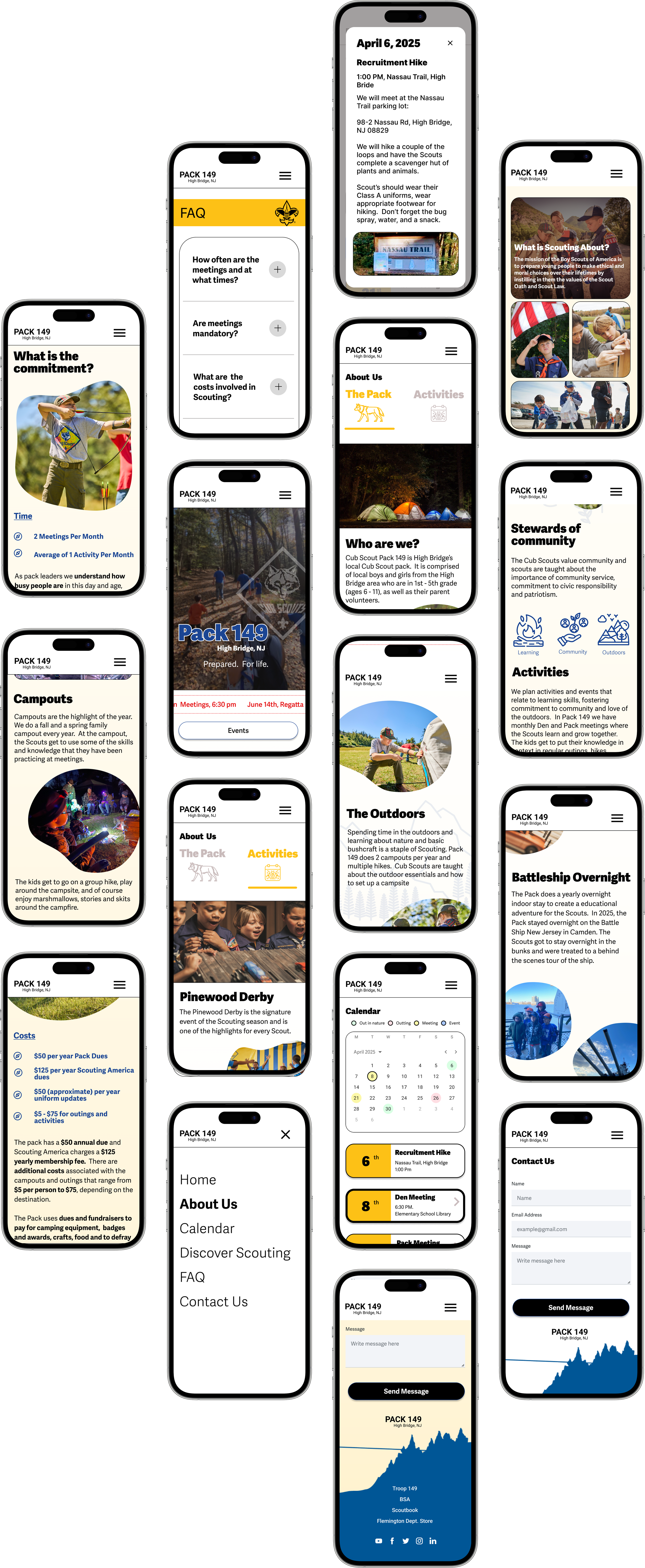 Pack 149 is a growing Cub Scout troop in High Bridge, New Jersey, looking to improve its digital presence to better support both current families and prospective members. The existing website lacked clarity, engagement, and up-to-date content—making it difficult for families to find event information, understand the scouting commitment, or feel a sense of community. This project involved stakeholder interviews, usability testing, and iterative design to create a modern, easy-to-maintain website that balances two core needs: serving as an information hub for current members and acting as a compelling recruitment tool for new families.
