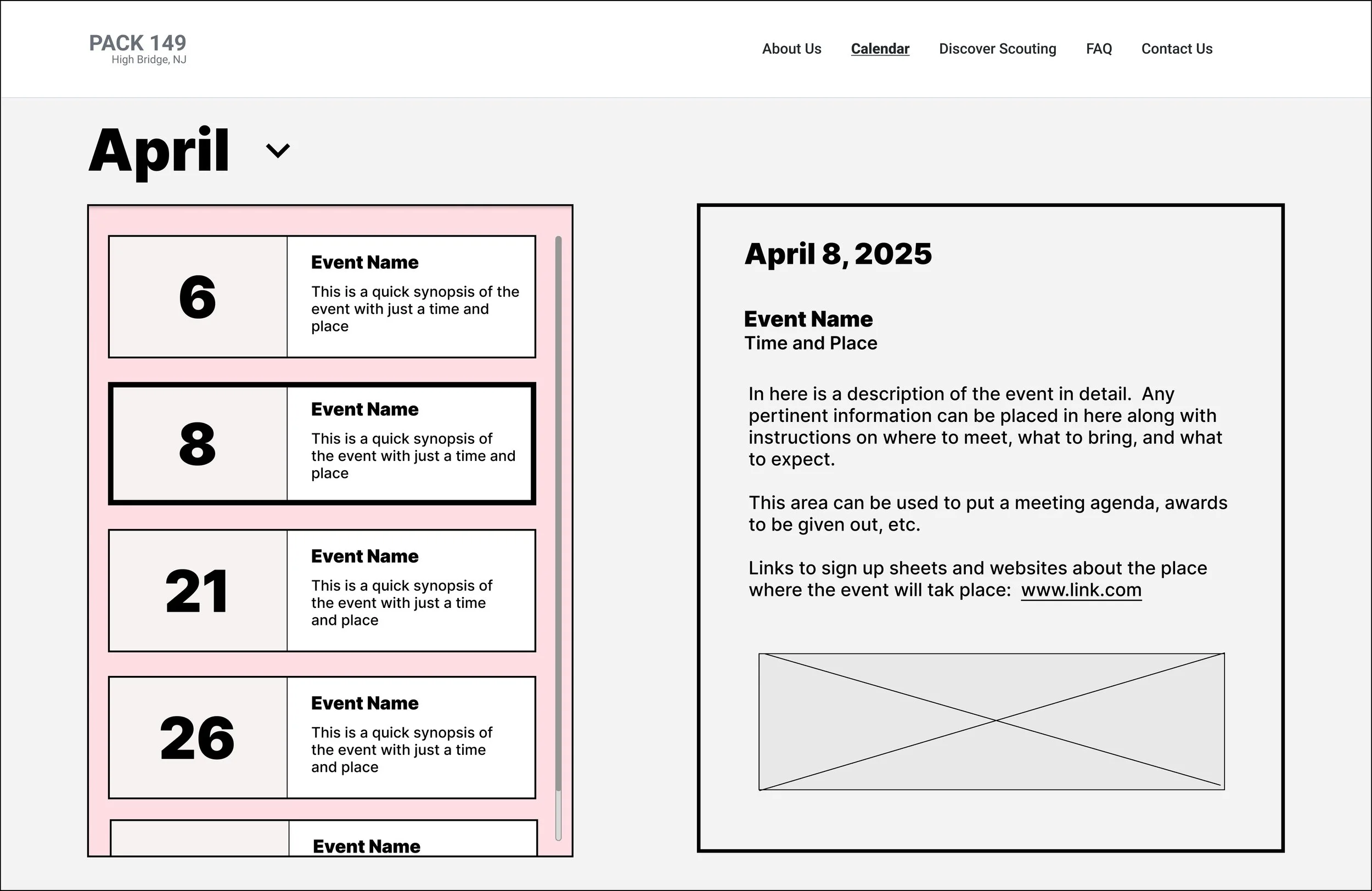 Redesigning the Pack 149 website was a deeply rewarding experience, both personally and professionally. Working with a real-world client taught me how to navigate limited stakeholder availability, balance differing needs, and lead productive conversations, even in short sessions.